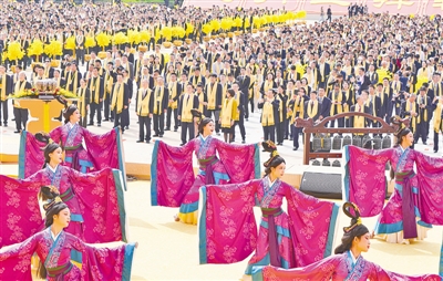當日上午,黃帝故里園區(qū)旗幡獵獵、莊嚴肅穆。南門廣場上,龍騰虎躍,鼓聲震天。寓意著中華兒女來自五湖四海的540名炎黃子孫,分別組成各90人的文化方陣、岐黃方陣、企業(yè)方陣、同拜方陣、臺胞方陣、僑胞方陣六大拜祖隊伍,整肅衣冠,佩戴黃帝絲巾,進尋根門、經(jīng)系祖壇、上軒轅橋、過故里祠,觀甲骨碑林方柱高舉,感杜嶺方鼎王者風范,聽青銅編鐘古音繚繞,最后緩步來到拜祖廣場,端詳兩側(cè)連廊浮雕,感觸中華文明五千多年的源遠流長。