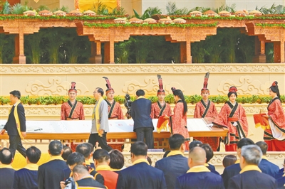 凈手上香。郝龍斌,全國人大代表、中國和平統(tǒng)一促進會香港總會常務副會長凌友詩,英國荷柏穎中藥公司總裁、第一位擔任英國市政廳閣員高職的華裔官員王臺生,泰國中華總商會主席林楚欽,緬甸中華總商會榮譽會長楊釧玉,華為集團高級副總裁楊瑞凱,深圳國際控股有限公司董事會主席李海濤,優(yōu)必選科技股份有限公司董事會主席、執(zhí)行董事兼行政總裁周劍,全國人大代表、全國勞模、好想你健康食品股份有限公司董事長石聚彬走到臺前,凈手上香。