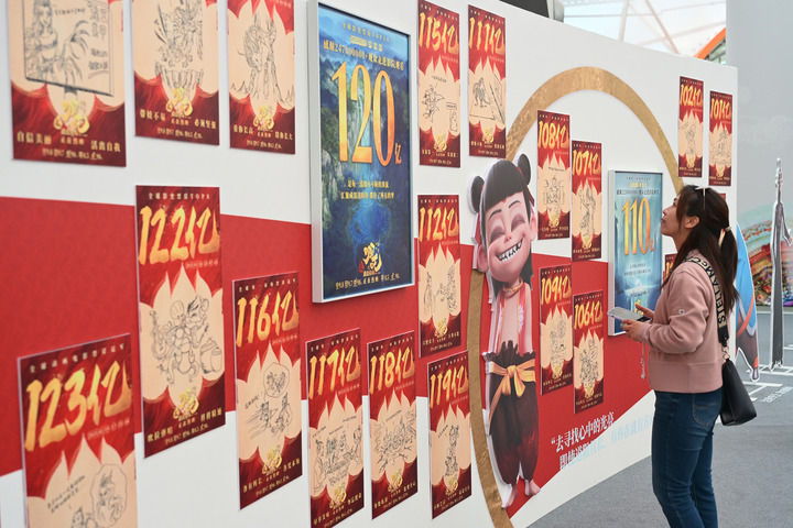 2025年4月19日,觀眾在電影《哪吒之魔童鬧?!肥掷L海報展上參觀。新華社記者 李鑫 攝