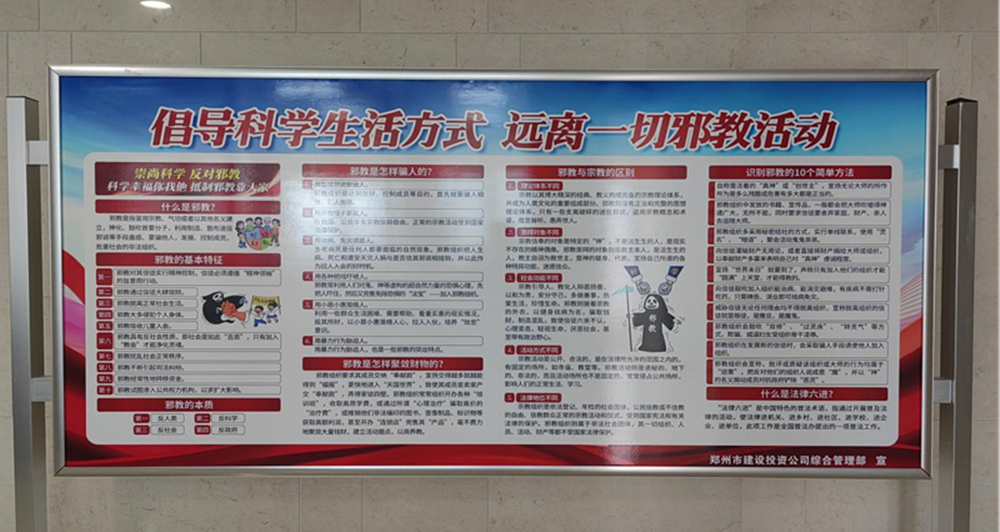 為了進一步提高國企員工反邪教意識,認識邪教的危害,切實增強自覺抵御邪教侵蝕的能力,營造積極向上、健康和諧的工作氛圍。4月25日下午,鄭州市建設(shè)投資集團有限公司組織全體干部員工開展反對邪教宣傳活動。利用PPT宣講、宣傳展板、網(wǎng)站、懸掛橫幅等方式,向員工宣傳邪教的種類、危害和邪教組織的種類等,引導(dǎo)國企干部職工認清邪教本質(zhì),提高識邪、防邪、拒邪能力,筑牢反邪教思想防線,做到對邪教歪理邪說不聽、不看、不信、不傳。
